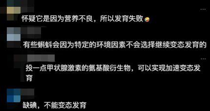 真的有很多高人在民间,确实当池塘保水太深、藻类密度低,蝌蚪得不到足够的蛋白质和碘源后,甲状腺轴启动不了,也会出现“只长个、不变态”的滞育现象,这些情况网友们都提到了。