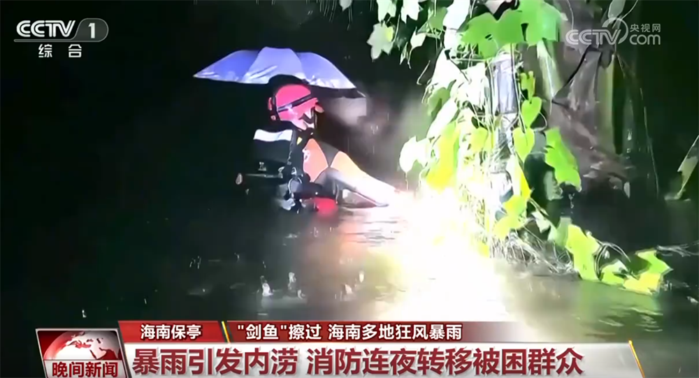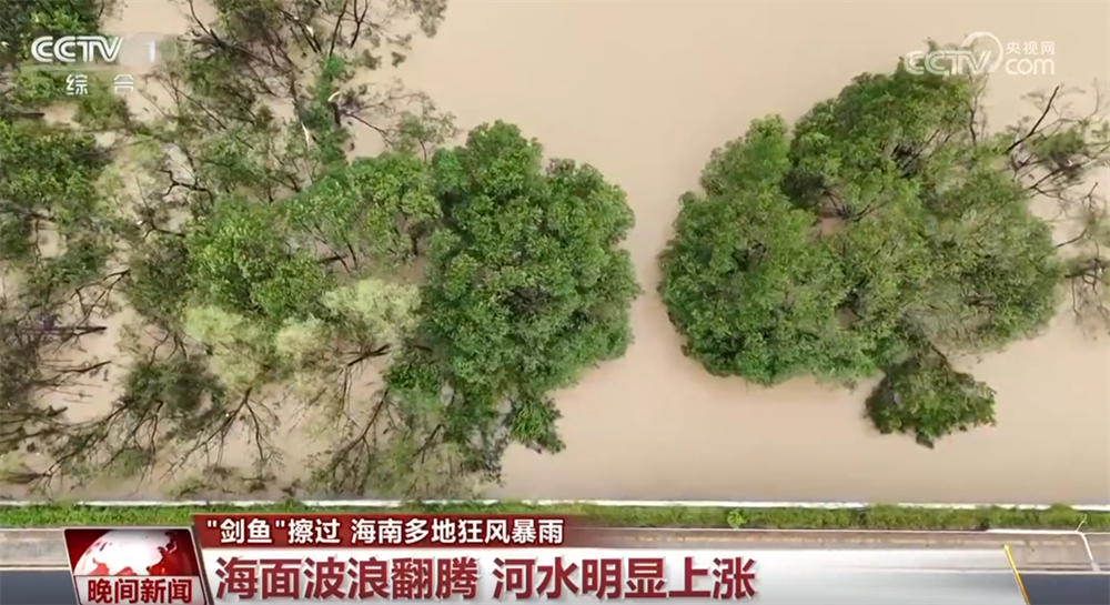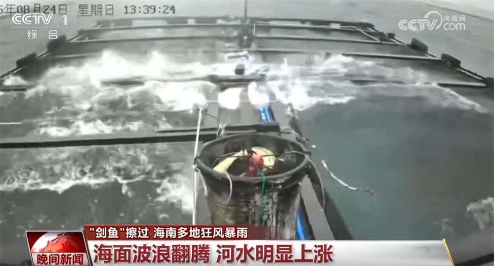 这是海南陵水黎族自治县深海养殖户提供的画面,只见深海养殖网箱在狂风巨浪中剧烈摇摆,海面波浪翻腾,这也让人直观地感受到“剑鱼”的威力。受降雨影响,三亚河水位出现明显上涨。