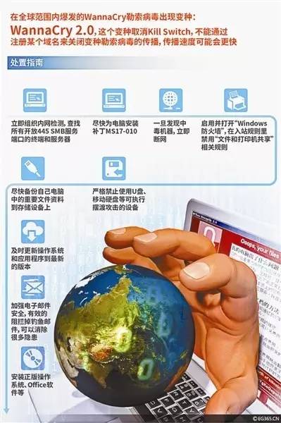 北京市委网信办、北京市公安局、北京市经信委联合发出《关于WannaCry勒索蠕虫出现变种及处置工作建议的通知》。《通知》同样指出,WannaCry 勒索蠕虫已经出现新变种,并给出了具体处理建议。