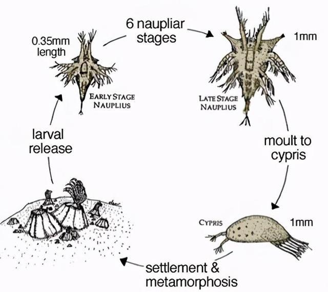 在年幼的无节幼虫阶段时,藤壶是一种没有外壳的、体型十分渺小,如同小虾小蟹,随着海水漂流,在海里四处移动。随后经过一次变态发育,发育成腺介幼虫。