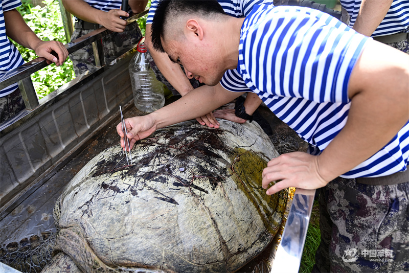 随后,官兵又拿起小铲子,一点一点为海龟清理藤壶。直到凌晨三点,海龟被顺利放归大海。