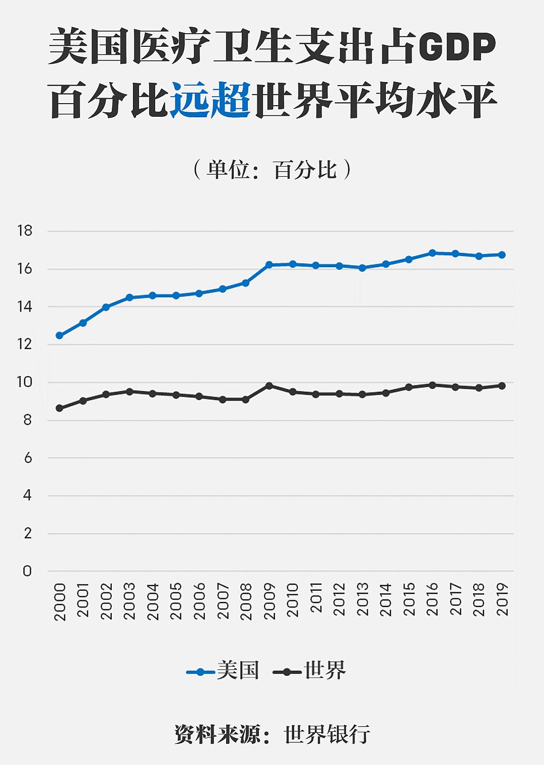 2021年美国社会的医疗卫生开支已经达到GDP的18%,世界上主要发达经济体经合组织国家的平均值则只有8.8%。然而高昂的医疗卫生开支并不意味着美国人的健康得到了更好的照料,相反,美国的人均预期寿命从2019年的78.86岁下降到2021年的76.6岁,已经低于中国。物美价廉的医疗服务对美国普通民众来说只能是望梅止渴。