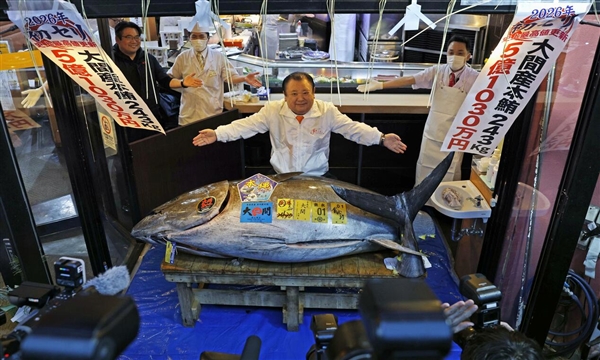 据悉,日本鱼市新年首场金枪鱼拍卖会是年度盛事,高价成交被视为“好运象征”,往往吸引各大寿司连锁企业参与竞拍。