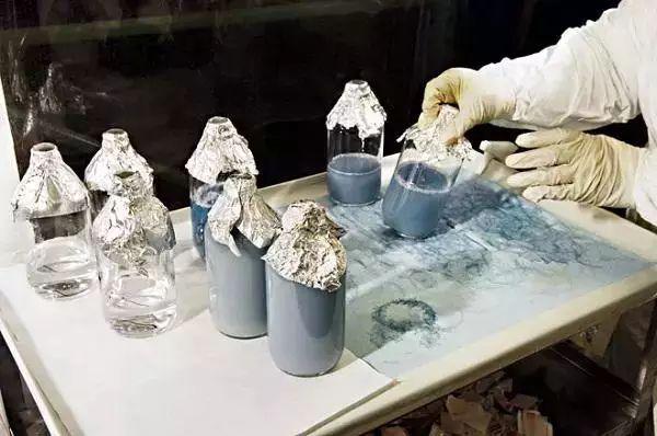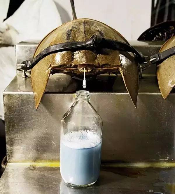 每只鲎都将被固定,然后他们使用不锈钢针刺入鲎的心包以提取输往心脏的含氧血。每个消毒瓶大约能收集到100毫升的血液。